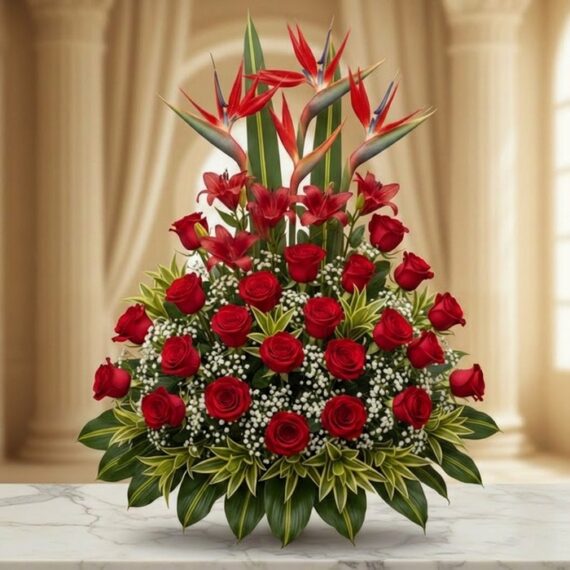 Impresiona a tus seres queridos con la espectacular y exótica belleza de nuestro Arreglo Floral Exótico Tucana. Este majestuoso arreglo combina la pasión de las rosas rojas, la elegancia de los lirios y el exotismo de las aves del paraíso, creando un regalo único y deslumbrante.
