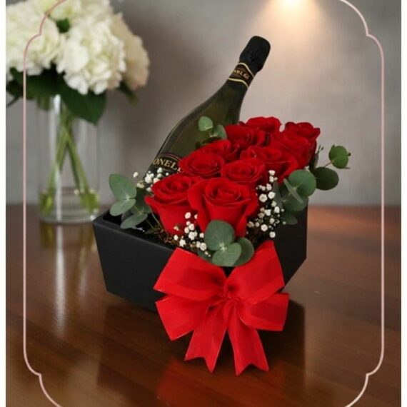 Arreglo Floral NATALE: Elegante Caja de Rosas y Vino 🍷