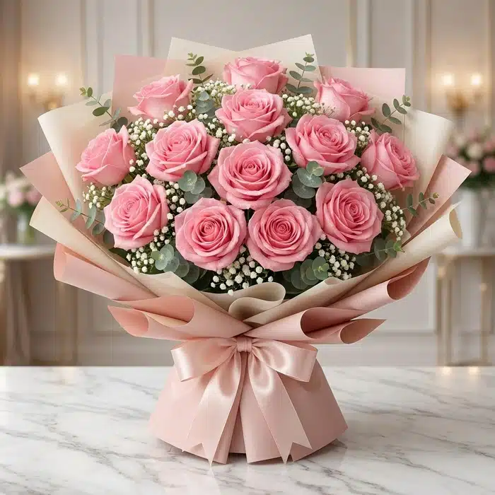 - 12 rosas rosadas que simbolizan amor, aprecio y ternura